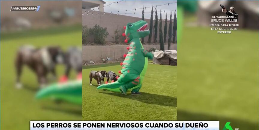 Con una mezcla entre miedo y curiosidad, estos perrosobservan desde dentro de la casa cómo se está acercando un dinosaurio a su jardín y se ponen a arañar el cristal para poder salir. Su dueño es quien se encuentra dentro de este disfraz hinchable, pero ellos aún no lo saben. Por eso, cuando salen al encuentro del prehistórico animal, dudan en si acercarse o no, como vemos en este vídeo de Aruser@s.