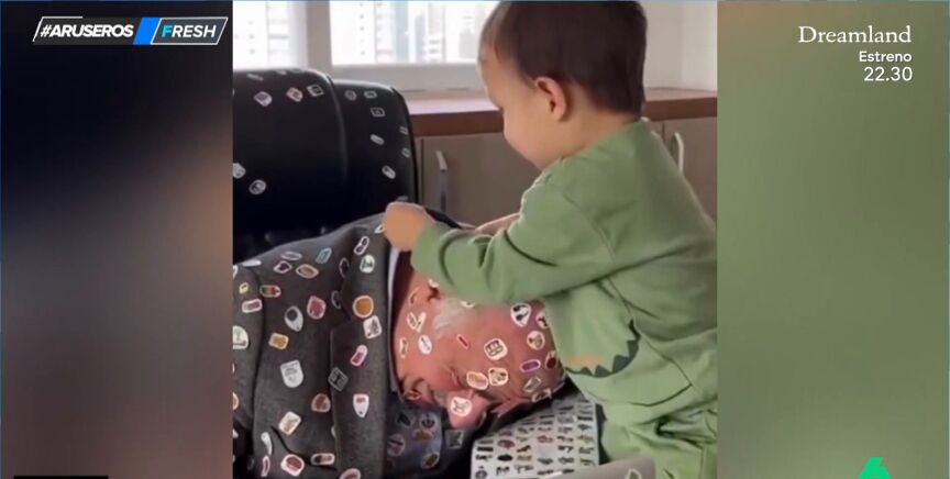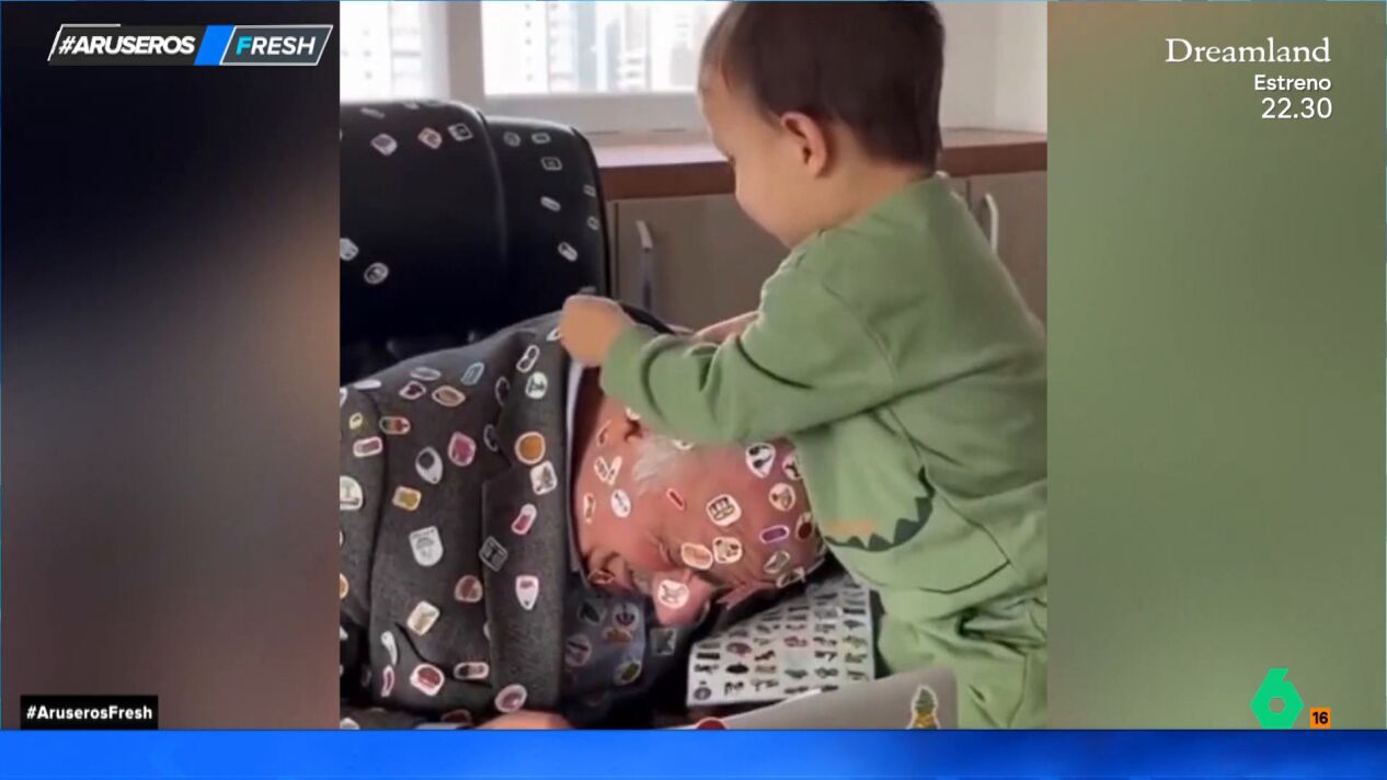 "¡Este abuelo tiene una paciencia!", comenta Alfonso Arús a sus compañeros mientras presenta este divertido vídeo viral. En las imágenes, aparece un niño poniendo pegatinas por todos los lados a su abuelo, que intenta trabajar frente al ordenador. Al parecer, al pequeño de la casa le han regalado decenas de pegatinas y ha decidido pegárselas todas a su abuelo.