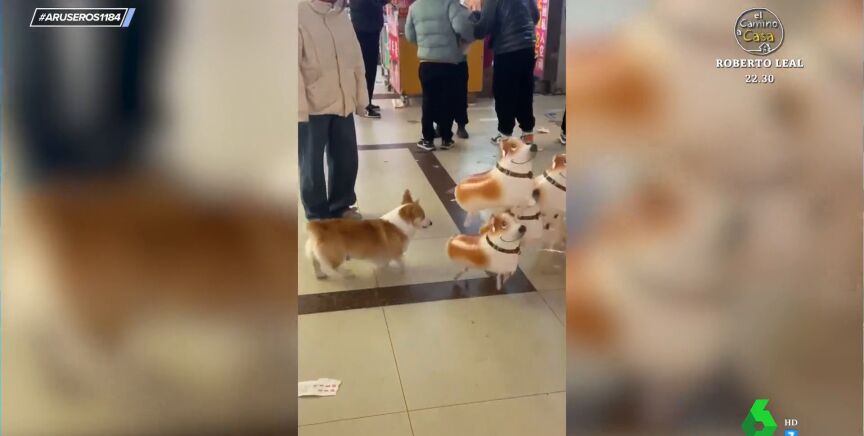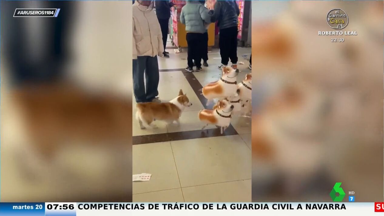 En este divertido vídeo viral emitido en Aruser@s somos testigos del desconcierto de este corgi al toparse en su camino con un montón de perretes que se parecen, y mucho, a él. Pero hay algo en ellos que no acaba de cuadrarle al can. "El pobre está tratando de olfatear los globos que flotan en el aire para ver si son de verdad, son de mentira, son de dibujos, son de carne y hueso...", comenta divertido con la escena Alfonso Arús.