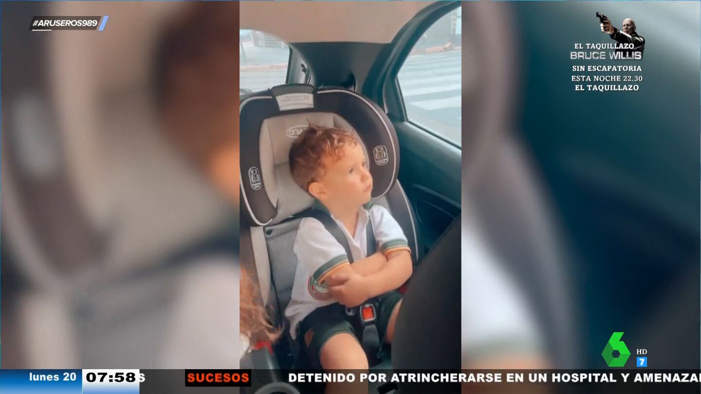 Con los brazos cruzados, mirando por la ventana y gesto de desesperación, el pequeño intenta pasar ese mal rato cuanto antes, mientras que su padre le graba y no puede dejar de reír ante su actitud de resignación. "El niño prefiere la de 'muchas novias' de Bad Bunny", opina Alfonso Arús.