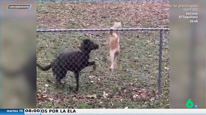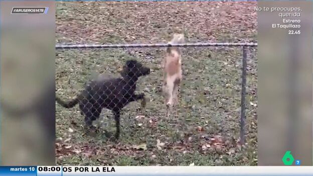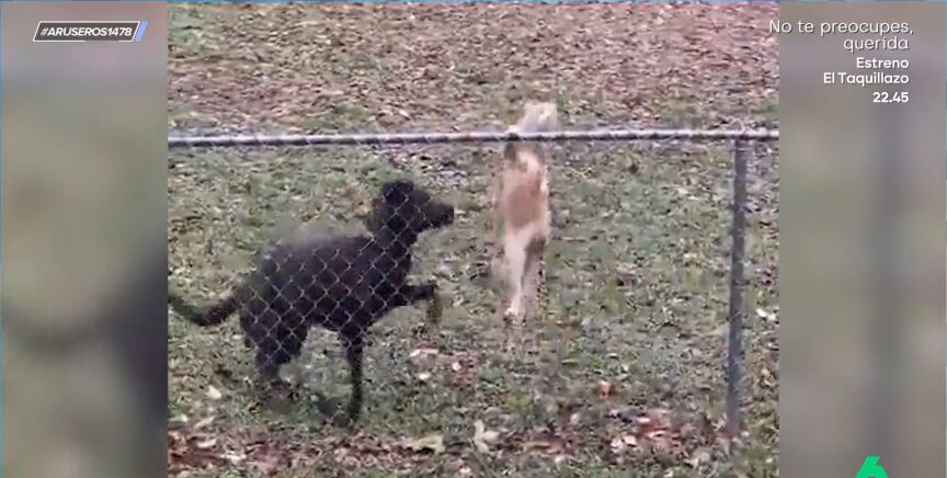 Por suerte, el perro de la familia sabe bien las intenciones que tiene su compañero y está muy pendiente para interceptarle a la menor señal de huida. Como vemos en estas imágenes, el can no duda en ponerse en pie para evitar que el felino escale por la alambrada.