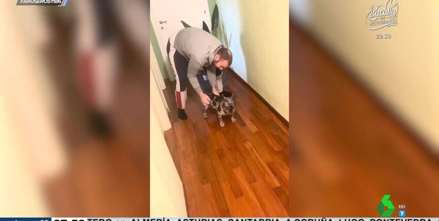 Sin embargo, una vez que lo consigue, el perro "se va pegando trompazos allá por donde va", de un lado al otro del pasillo; describe el presentador del programa. "Pero la sensación al principio es como si le dieran cuerda. Va arrancando", matiza. "Va cogiendo carrerilla y va derrapando", añade Hans Arús.