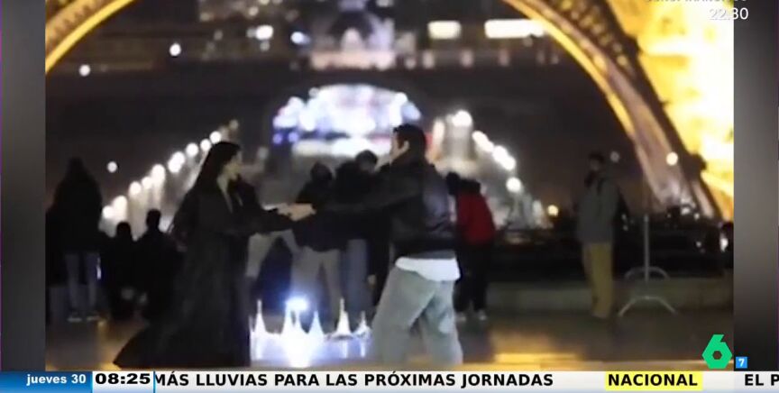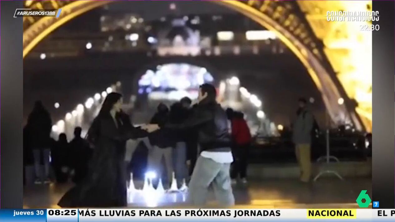 Tatiana Arús enseña en el plató de Aruser@s las románticas imágenes de Dua Lipa y su prometido, el actor Callum Turner, en París. "Parecen imágenes sacadas de una película", destaca la colaboradora de Aruser@, que explica que "después de disfrutar de una lujosa cena han protagonizado este espontáneo baile".