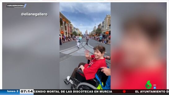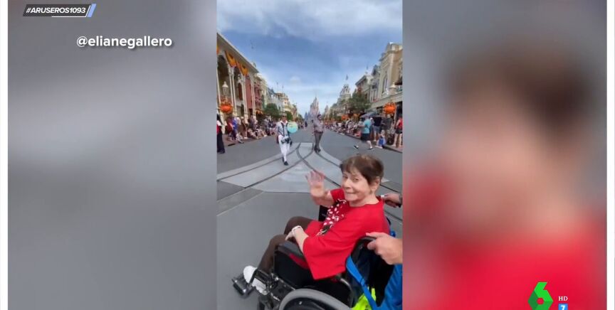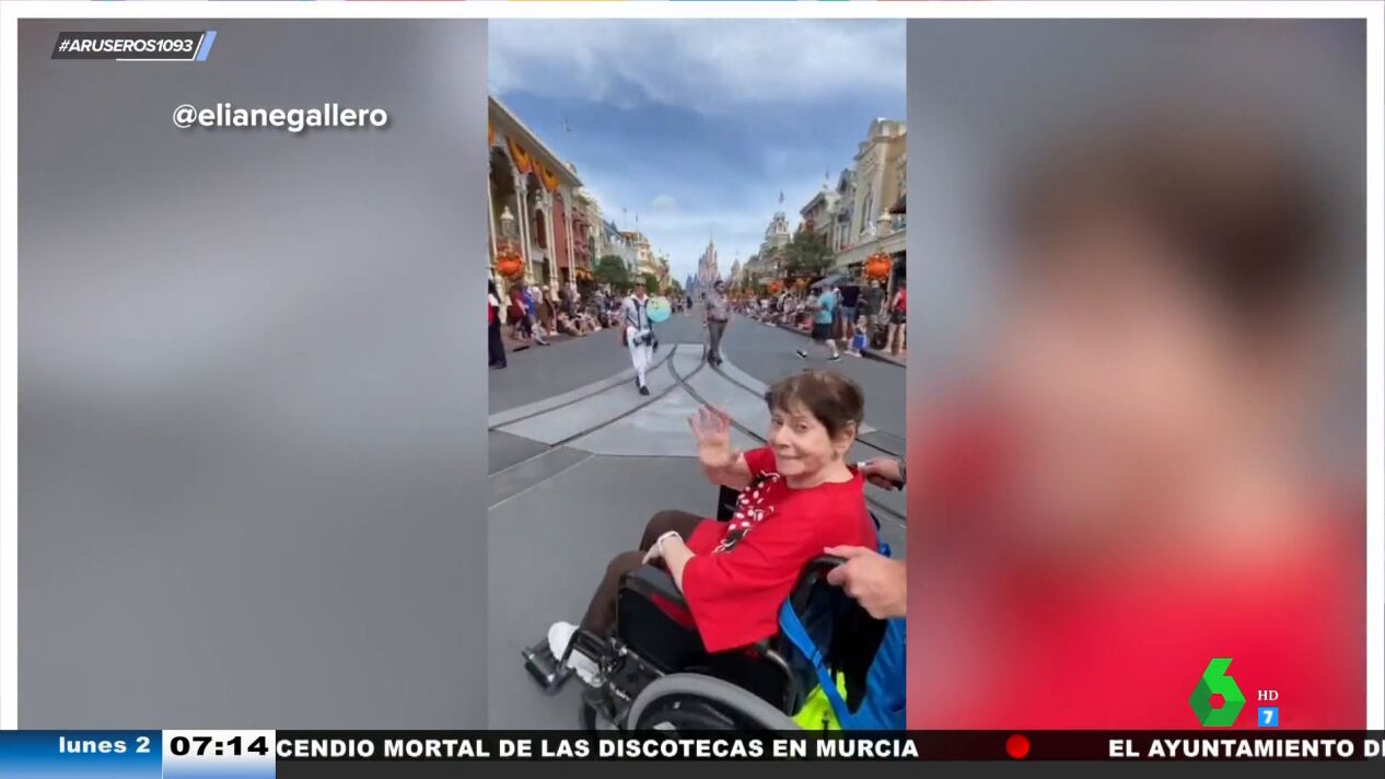 "Mira dónde estamos... ¡Disney!". Esta anciana no puede creer que por fin haya hecho realidad una de las ilusiones de su vida: viajar a DisneyLand. Y todo ello gracias a su nieta y a su familia.