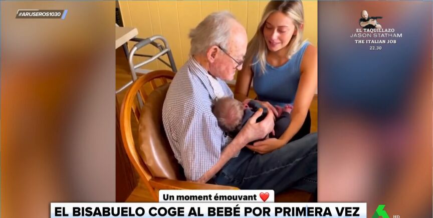 La nieta de este hombre de 95 años, que acaba de tener un bebé, le presenta a su hijo a su abuelo. El anciano coge entre sus brazos al pequeño a pesar de sus problemas de movilidad.