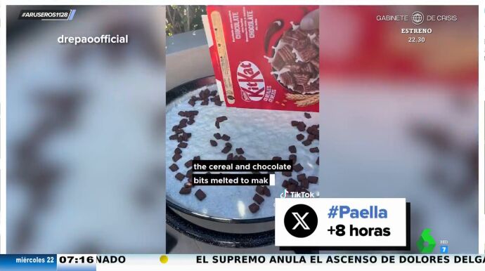 Como se puede ver en el vídeo principal de esta noticia, el chico hace paellas de KitKat, chuches o Taco Bell. "Creo que el problema está en llamarlo paella", destaca Angie Cárdenas, que defiende que se puede llamar "arroz dulce": "Para mí es un postre, me parece muy bien". Pero Alfonso Arús sigue muy indignado aunque Angie Cárdenas y Tatiana Arús lo defiendan: "¿Pero cómo podéis decir que está muy bien?, no lo he probado ni lo voy a probar".