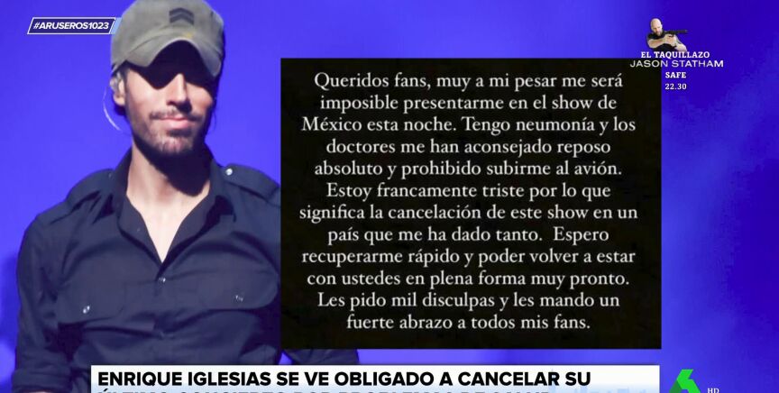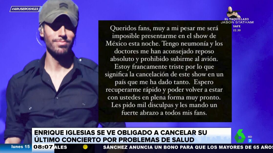Enrique Iglesiasha anunciado a través de un comunicado en sus redes sociales que ha cancelado su próximo concierto en México por prescripción médica. "Queridos fans, muy a mi pesar me será imposible presentarme en el show de México esta noche", comenzaba el artista el comunicado, que continuaba detallando que sufre una neumonía por la que sus médicos el han recomendado reposo absoluto y le han prohibido, incluso, subirse a un avión.