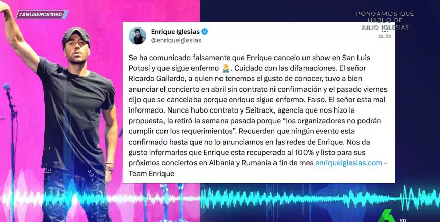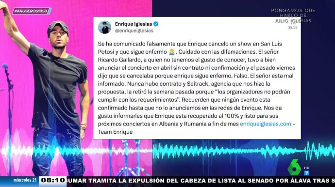"Se ha comunicado falsamente que Enrique canceló el show y que sigue enfermo", se puede leer en un mensaje en las redes del artista, donde se detalla que "nunca hubo contrato porque los organizadores no podían cumplir con los requerimientos".