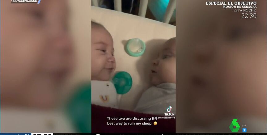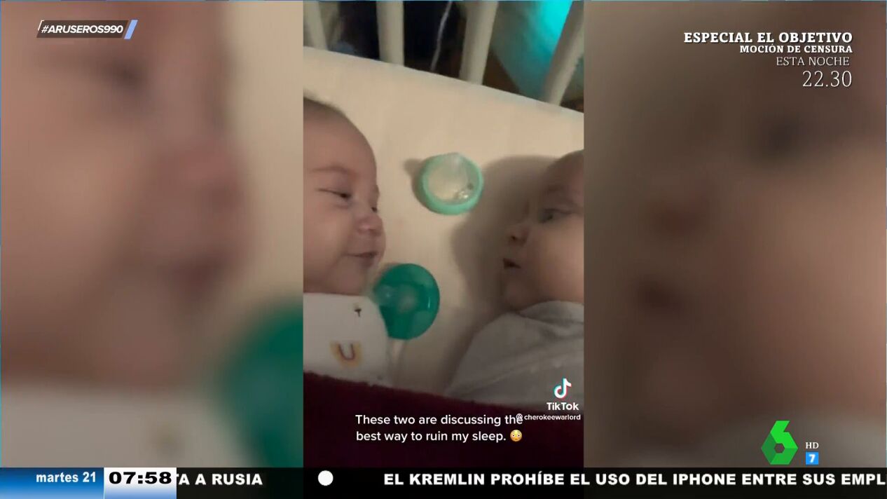 Estos dos pequeñiñes están muy entretenidos en su cunita acostados uno al lado del otro charlando sin parar en lugar de dormirse, aunque solo tengan unos meses y aún no hayan aprendido a hablar. "Esta es la prueba de que los gemelos siempre conversan aunque sean muy chiquitines", asegura Alfonso Arús antes de dar paso al entrañable vídeo.