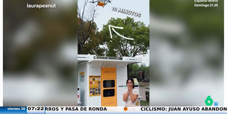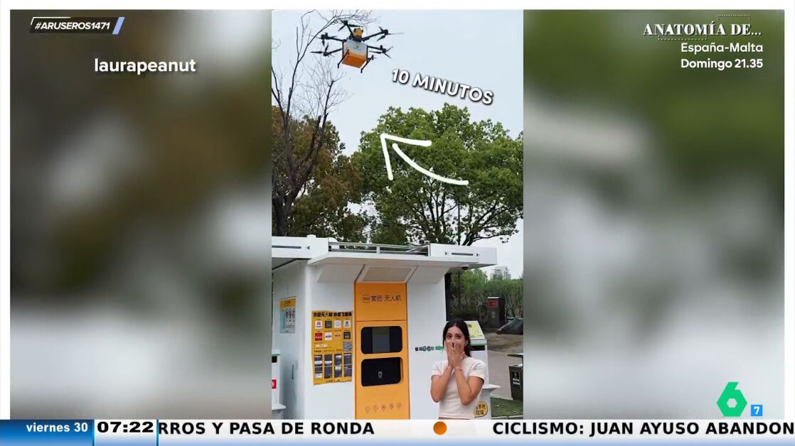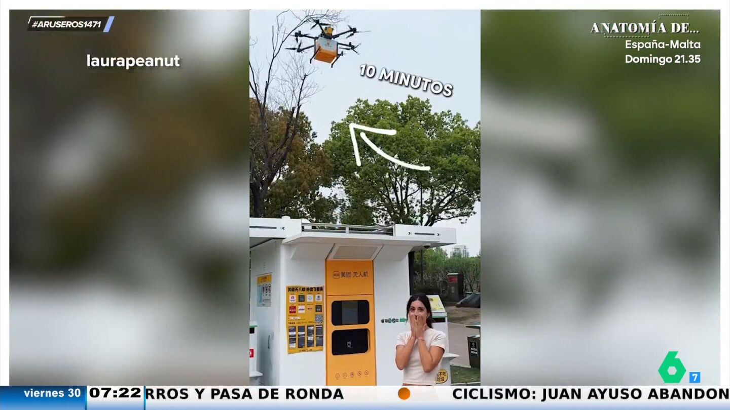 La tiktoker española @laurapeanut nos cuenta lo que acaba de descubrir en su último viaje a China: los drones que reparten café. "Esto es el futuro", cuenta alucinada. Y lo mejor de todo es que cuesta 4 euros.
