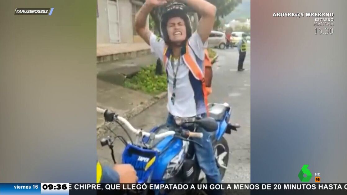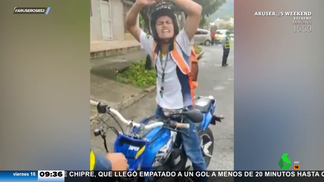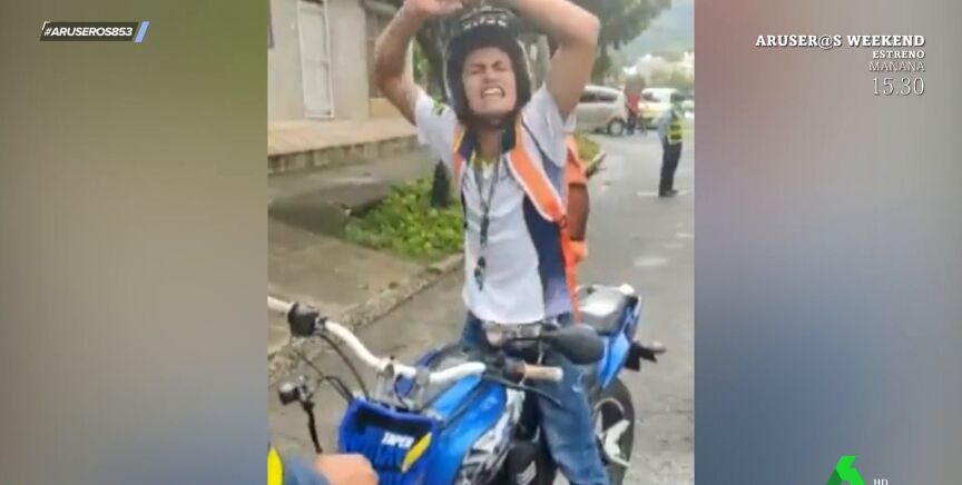 Con gritos, llantos y pataletas. Así reacciona este motorista, que ha perdido los papeles de manera literal y figurada. El hombre viaja sin la documentación del vehículo y la policía le detiene y le amenaza con inmovilizar su motocicleta. Para librarse de los agentes, monta una 'bronca' tremenda, con baile ridículo incluido.