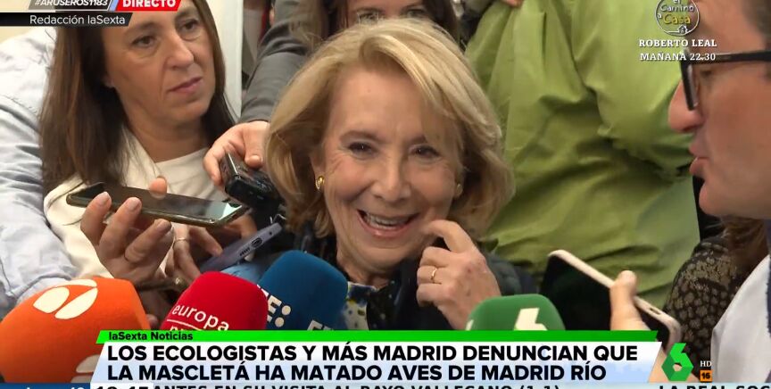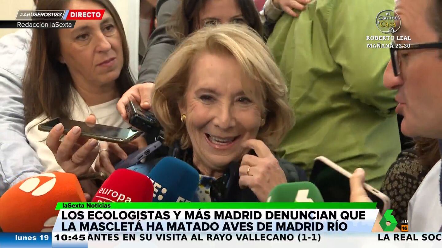 La expresidente madrileña Esperanza Aguirre ha estallado en carcajadas al ser preguntada por las aves muertas en la mascletá celebrada este domingo en Madrid. "Bueno, bueno... se ha muerto un pato", ha aseverado la 'popular' intentando alejarse de todo dramatismo.