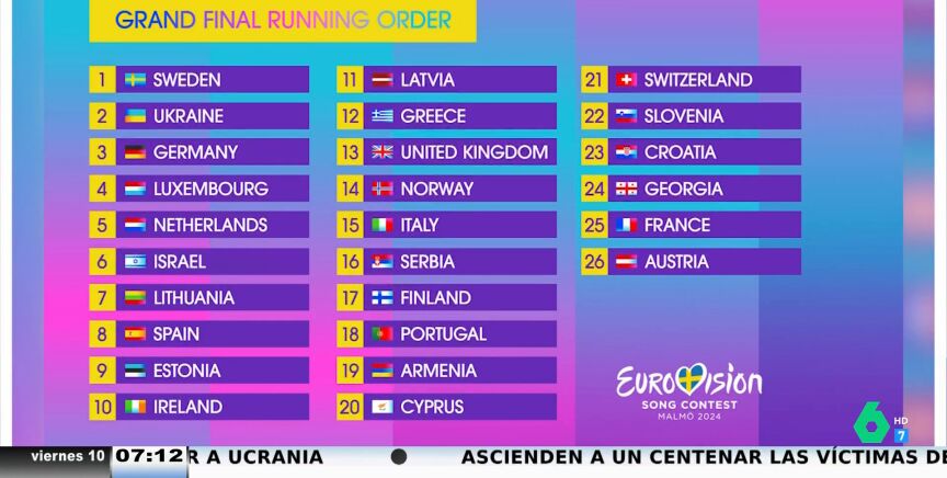 Concluida la segunda semifinal, ya tenemos la lista definitiva de los 26 países que actuarán en el festival de Eurovisión. España representada por Nebulossa actuará la octava, mientras que Francia será quién abra el certamen y Austria la última en cantar.