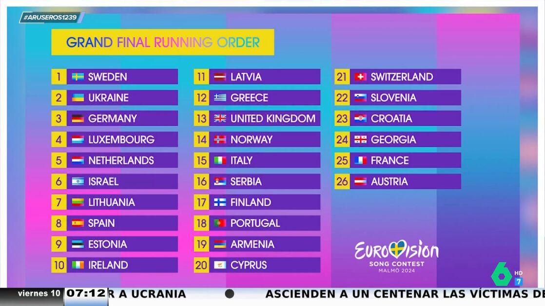Tras la segunda semifinal, ya se han confirmado los 26 países que participarán en la final de Eurovisión. España será el octavo país en actuar, Nebulossa cantará en el mismo puesto en el que lo hizo Blanca Paloma el año que el festival se celebró en Liverpool. Francia será quien abra el certamen y Austria la última nación en actuar. "¿Nos beneficia actuar los octavos?", pregunta Angie Cárdenas. Hans Arús le responde que "ni nos beneficia ni nos perjudica pero te acabas acordando más de los últimos en participar".