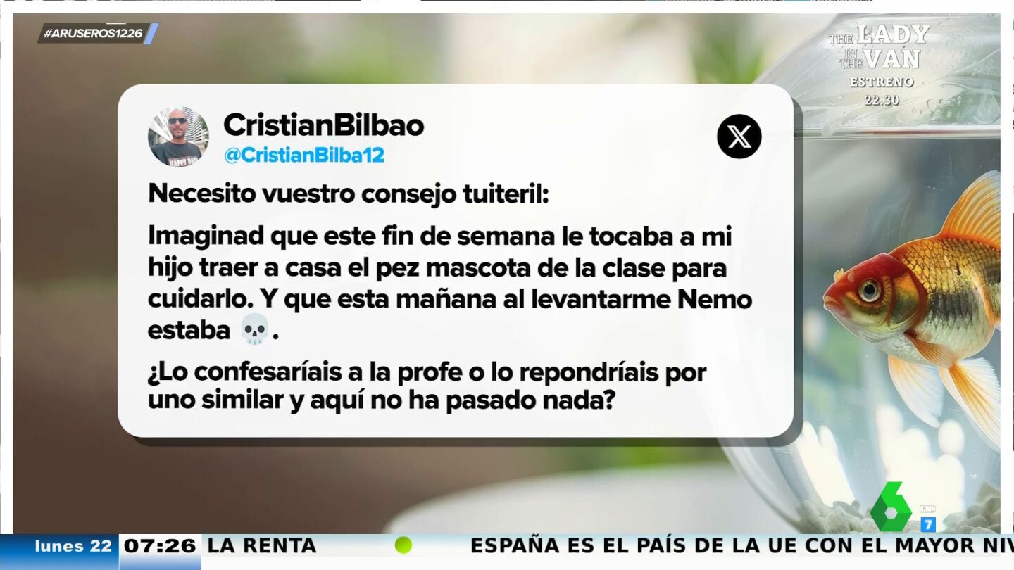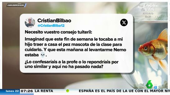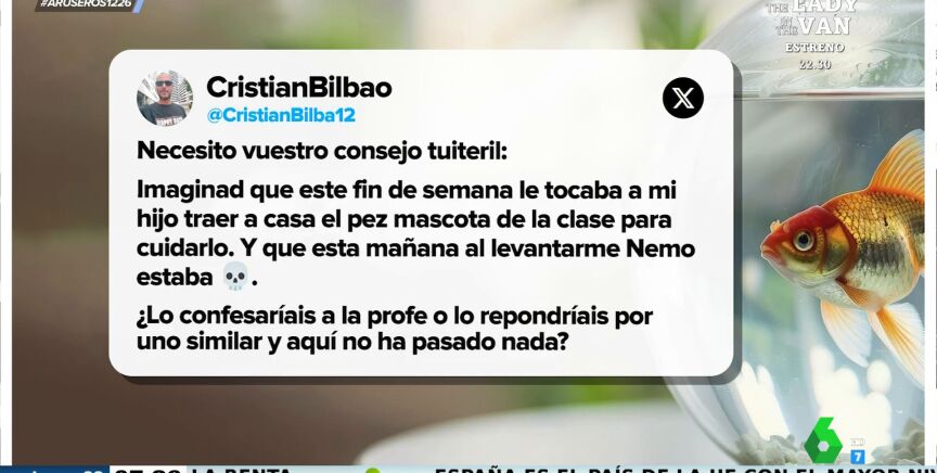 Este padre tenía que cuidar durante este fin de semana al pez que tiene su hijo en clase pero ha tenido mala suerte, cuando se ha levantado, el animal había muerto. Ante la desesperación de no saber que hacer el hombre ha acudido a X para preguntar qué hacer. "¿Lo confesaríais a la profe o lo repondríais por uno similar y aquí no ha pasado nada?", preguntaba en el tweet.
