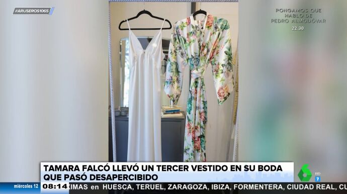 Sin embargo, Tamara Falcó no solo llevó ese vestido de novia. La marquesa de Griñón también lució el día de su boda hasta tres vestidos. Tatiana Arús enseña en el plató de Aruser@s "las imágenes de un Íñigo Onieva algo molesto llegando a las 8 de la mañana junto al botones, que llevaba una funda del camisón de novia que estaría valorado en 500 euros".
