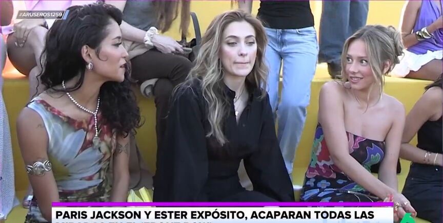 Tatiana Arús enseña en el plató de Aruser@s los mejores momentos del desfile de la colección Crucero de Desigual, donde hemos podido ver a famosos como Ester Expósito y Paris Jackson, hija de Michael Jackson. "Compartían asiento, pero o no se conocían o no guardan buena relación porque se ignoraron todo el rato", destaca Tatiana Arús, que explica que "veíamos a Paris un poco colgada porque no conocía a nadie".