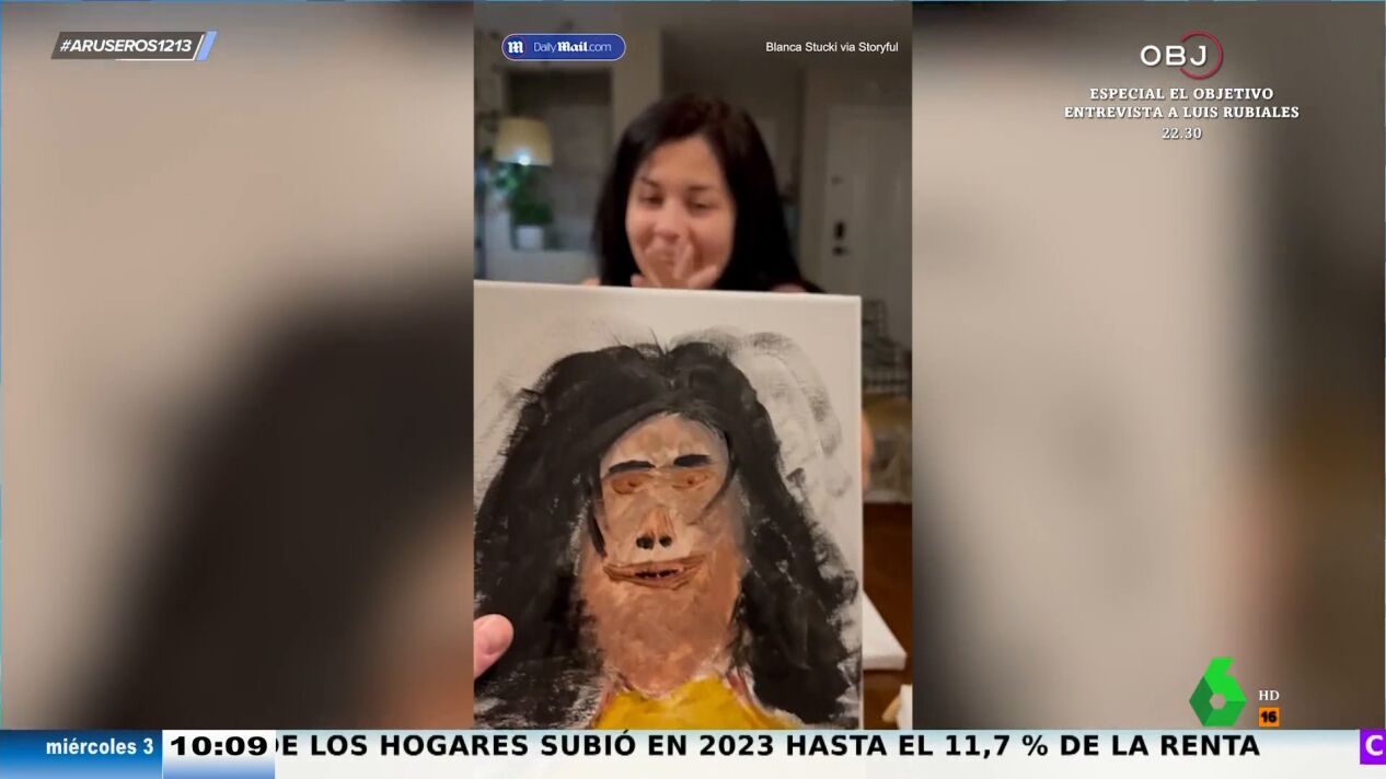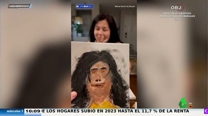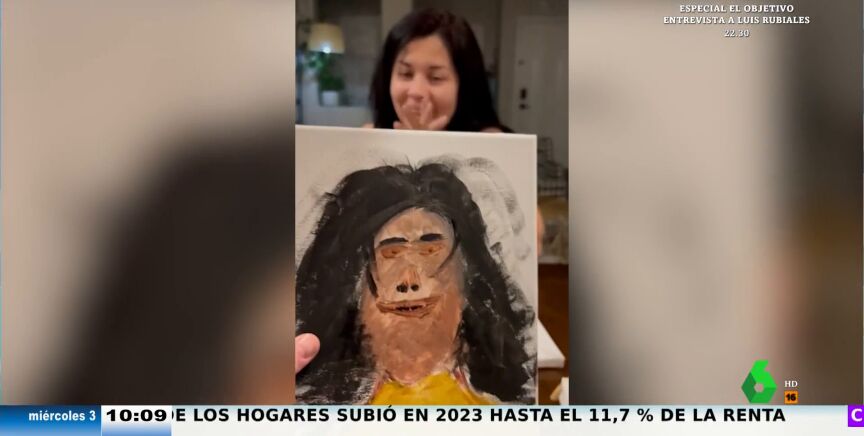 "Esto es un simio, ¿así me ves?", pregunta la esposa al ver el resultado. "Es peor que el Ecce Homo", reacciona Tatiana Arús . David Broc cree que "ni queriendo hacerlo mal" le puede salir así. El presentador expone que una cosa es que no sepas pintar y pongas dos ojitos y una boca sonriente, pero "aquí se ha esmerado mucho en dejarla muy mal", comenta.