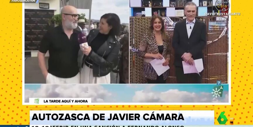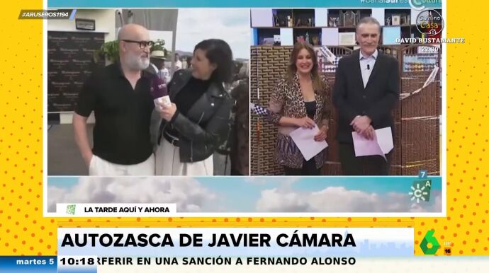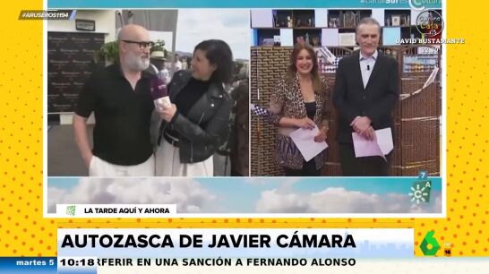 "¡Ay, Juan y Medio!", destaca el actor, que afirma que el programa no se ve en Madrid. "Sí se ve, todo es ponerse", explica en directo la reportera a Javier Cámara. "Ah, la madre que me parió", afirma avergonzado el actor en este cómico vídeo, donde no para de cometer divertidos fallos, como preguntarle si sigue entrevistando a niños, algo que hacía en otro programa.