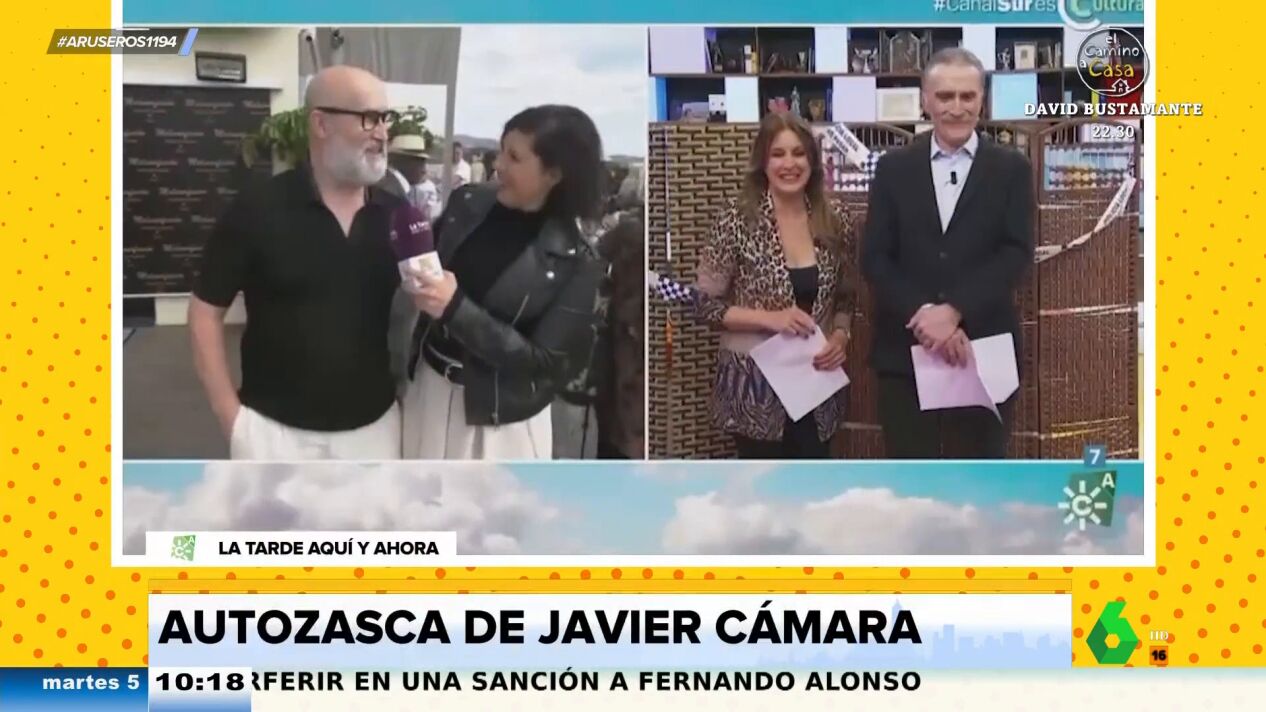 Alfonso Arús enseña en el plató de Aruser@s este cómico vídeo protagonizado por Javier Cámara. El actor pregunta a la reportera en directo de qué programa es y cuando la joven le explica que es el de programa de Juan y Medio , Javier Cámara se viene arriba.