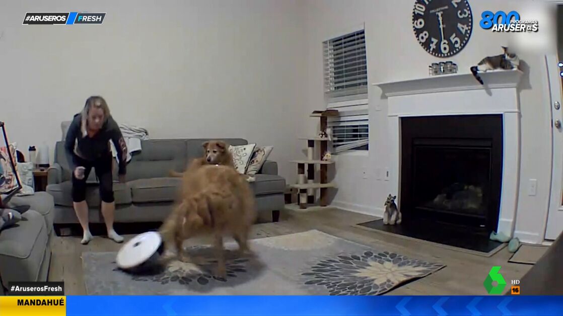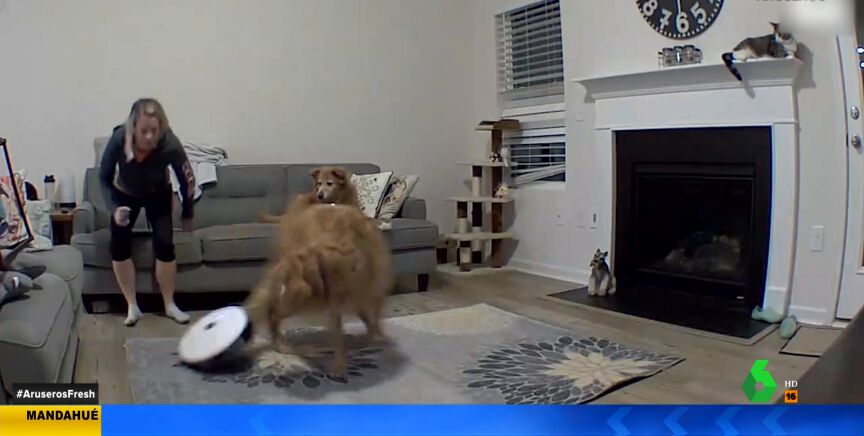 Para ello, se enfrenta directamente a este inocente Golden retriever que dormita plácidamente en la alfombra del salón cuando el robot aspirador le ataca a traición por la espalda. El perro, asustado, intenta zafarse de su agresor, que le ha agarrado la cola y no quiere soltarse.