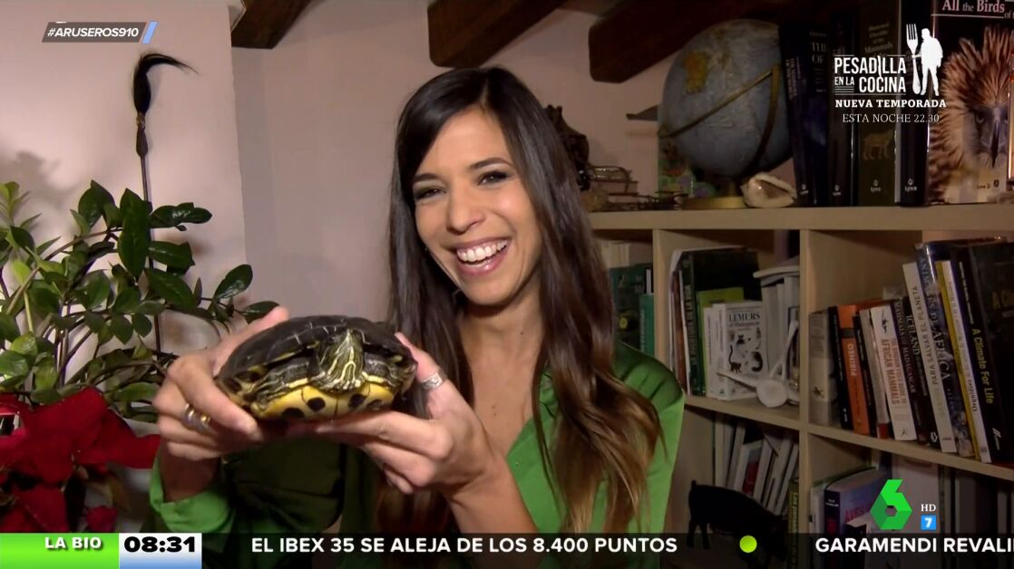 Esta tortuga que acompaña a Evelyn Segura en su conexión en directo en Aruser@s durante el día de hoy, apareció en una balsa para arrear los huertos del pueblo en el que habita la bióloga, que tiene que ser reparada por una fuga de agua.