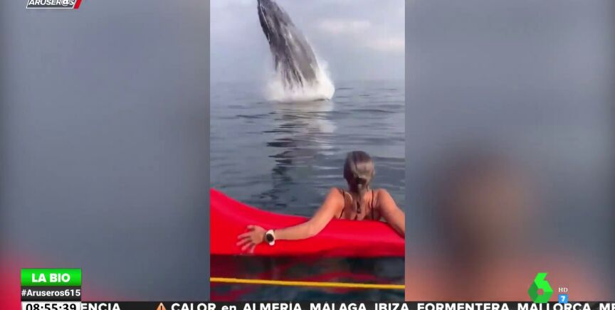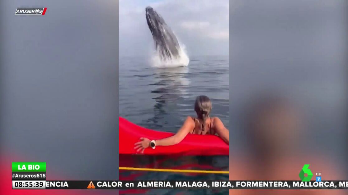 Como se aprecia en el vídeo que acompaña a estas líneas, la piragüista estaba descansando en el mar cuando de repente el animal saltó a escasos metros de ella sin previo aviso, dándole un buen susto.