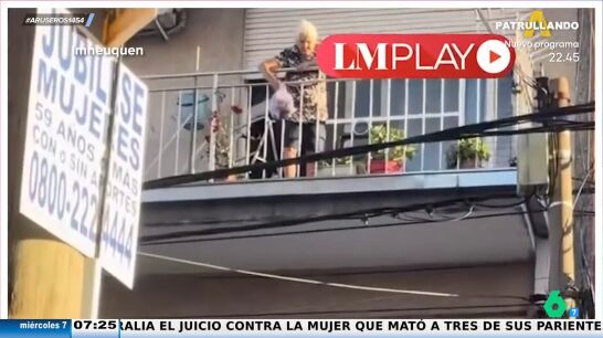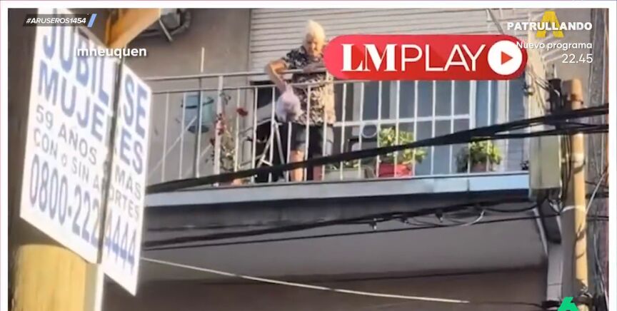 Se trata de una abuela que está en su balcón con una bolsa de basura en la mano con intención de lanzarla desde el segundo piso donde se encuentra y meterla directamente en el cubo que está en la calle.