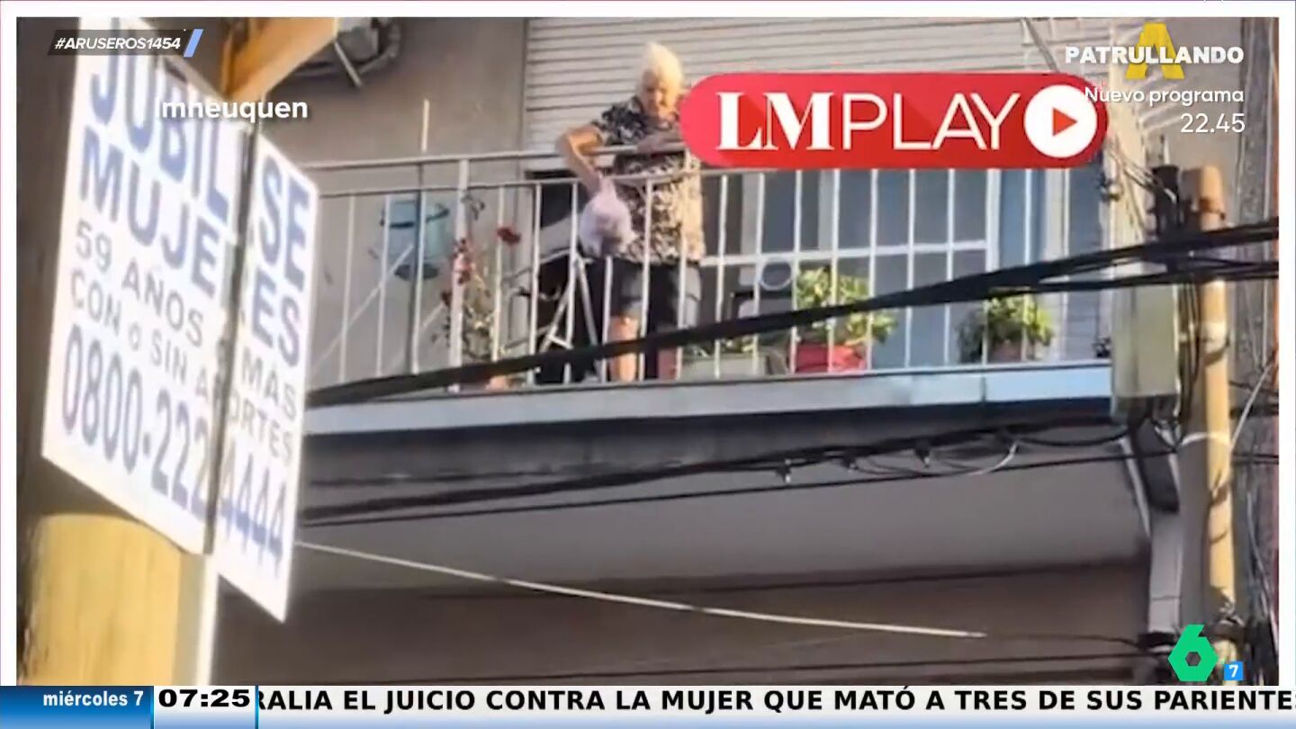 Unos chavales que graban el momento desde la acera de enfrente se quedan impresionados al ver la extraordinaria puntería de la abuela, que tras ver la ovación que le hacen los jóvenes les regala un divertido saludo.