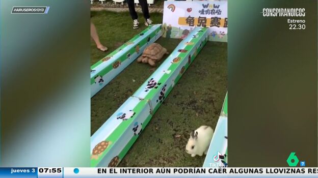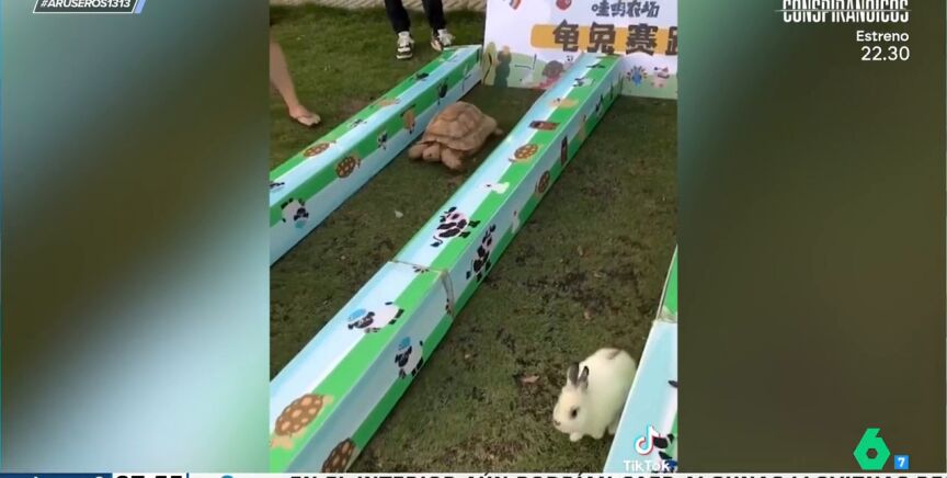 "Este vídeo se está viralizando mucho", anuncia Alfonso Arús. Un grupo de personas deciden ver si la fábula de la liebre y la tortuga es real, solo que cambian la liebre por un conejo. En las imágenes se puede ver a los dos animales listos para la carrera. Al inicio el conejo toma la delantera, pero como en la fábula se distrae, mientras la tortuga sigue caminando lenta pero constantemente.