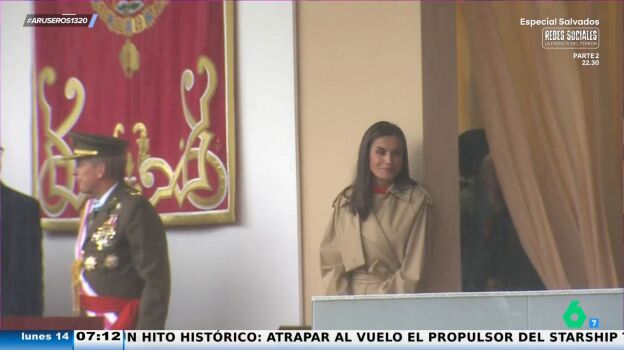 La reina Letizia ha protagonizado una de las imágenes del desfile del 12 de octubre al quedarse sola refugiándose de la lluvia mientras el resto de los presentes charlaba en el palco.