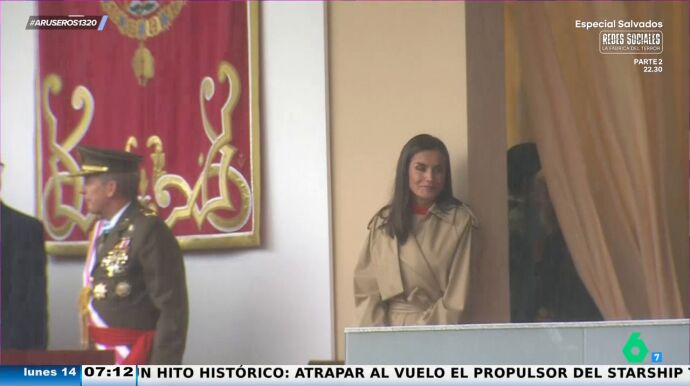 Los reyes y la princesa Leonorhan presidido, como todos los años, el desfile del 12 de octubre, que ha sido empañado por la lluvia en la plaza Neptuno. "En algunos momentos tuvieron que resguardarse", destaca Tatiana Arús, que enseña el look que llevaba la princesa Leonor: "Por segundo año consecutivo llevó la indumentaria de la Armada, en este caso, es el traje de gala que lleva por nombre '14 botones'". "Es el traje de gala de invierno de la Escuela Naval Militar", explica la colaboradora, que destaca que "lleva un cordel en el brazo izquierdo que es para alumnos aventajados".