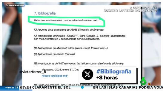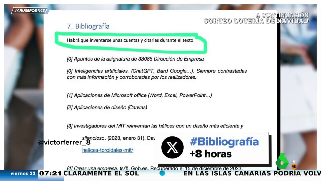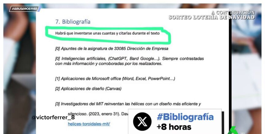 "En la Bibliografía no entiendo muy bien lo de 'inventarse unas cuantas', supongo que queréis decir 'localizar unas cuantas que sean adecuadas para nuestro trabajo'", reprende el docente, con mucha clase. "¡Pero, serán descuidados!", se indigna Alfonso Arús en plató. El truco para que esto no ocurra, cuenta María Moya, es poner este tipo de anotaciones en otro color.