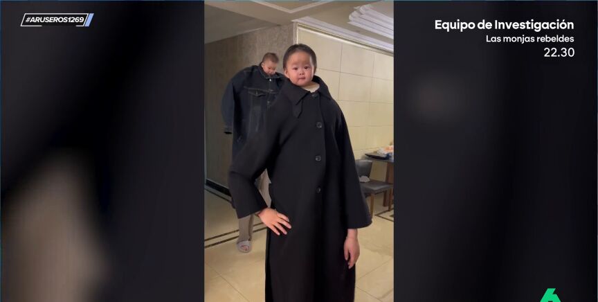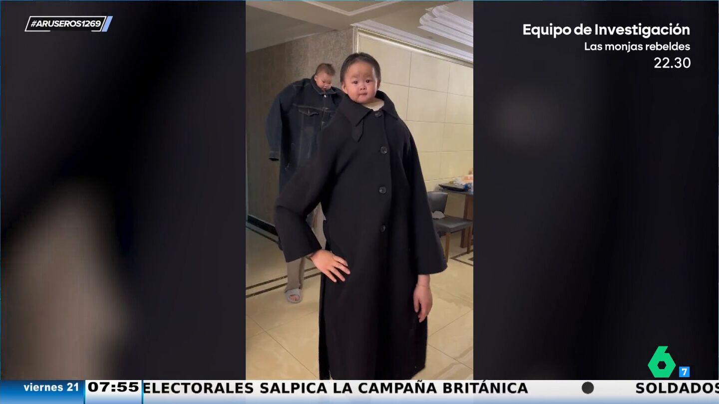 "Esto es lo que se lleva ahora, que el bebé parezca un adulto", expone Alfonso Arús antes de reproducir el vídeo principal de esta noticia. Unos adultos cogen a hombros a sus hijos y se ponen una gabardina larga para que de la impresión al verlo de que es un cuerpo de persona mayor con cabeza de niño.