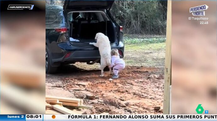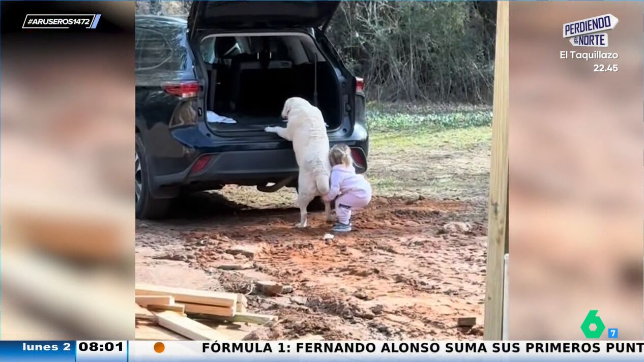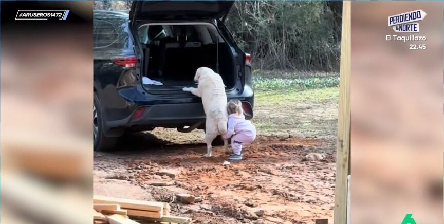 Su can, sin embargo, le triplica en tamaño, algo que convierte la situación en un momento divertido. Pese a que el perro parece coger impulso su ayudante no logra que suba. "La niña lo intenta de todas formas", comenta Alfonso Arús mientras vemos el viral.