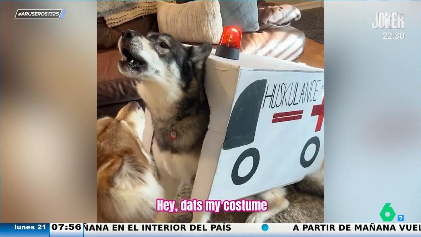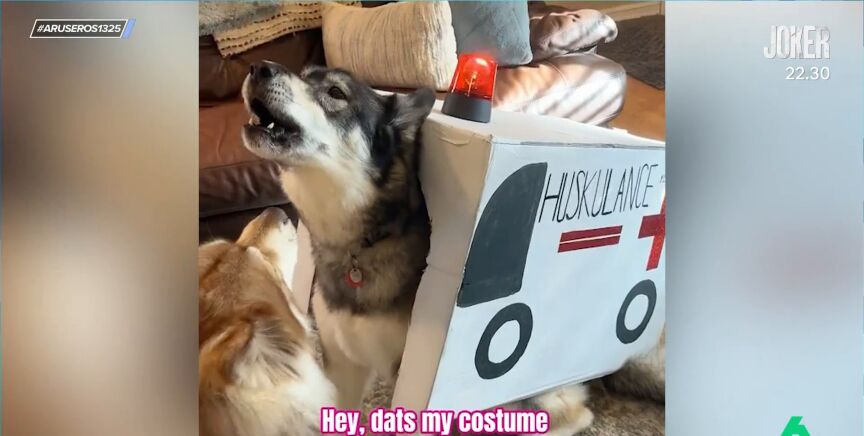 Un husky disfrazado de ambulancia se mete de lleno en el papel de su disfraz. El animal comienza a ladrar simulando el sonido de una sirena en un tono no muy alto hasta que llega otro perro y empieza a hacer el mismo sonido pero mucho más alto.