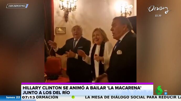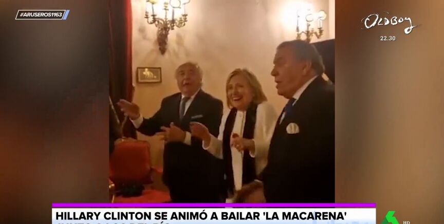La norteamericana no dudó en ponerse a bailar 'La Macarena' en cuanto sonaron los primeros acordes, un tema que, recuerda Tatiana Arús en plató, ella conoce muy bien. "Esta coreografía se la sabe, puesto que Bill Clinton en 1996 ya la utilizó en su campaña de reelección", cuenta.