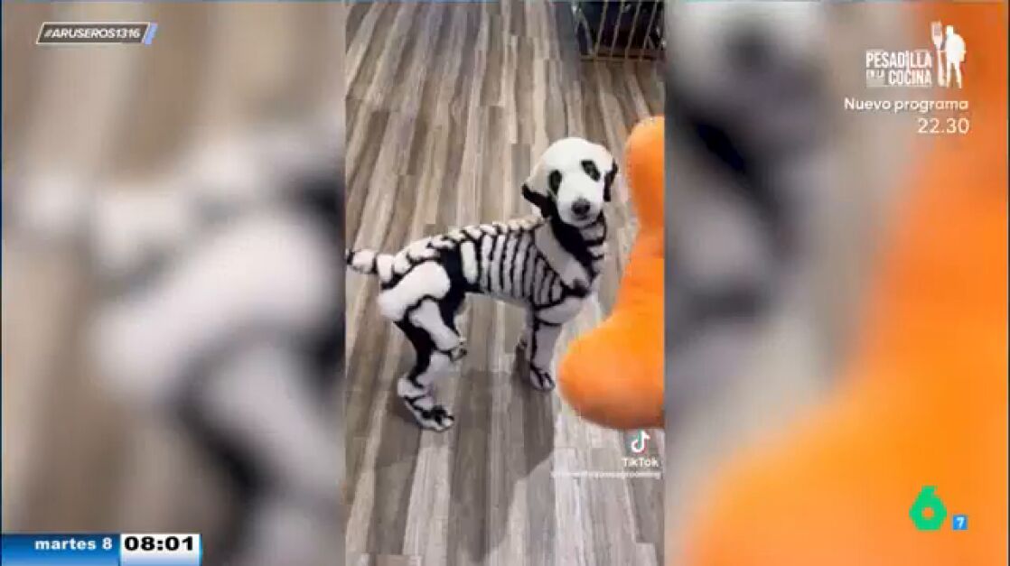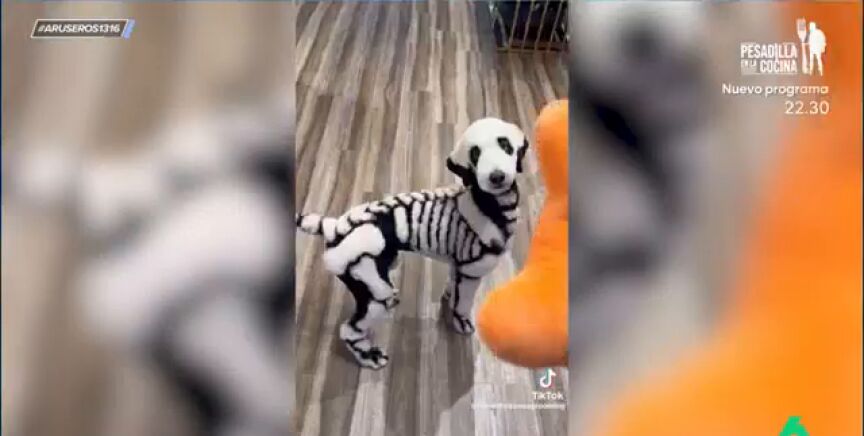 "Se nota que Halloweenestá a la vuelta de la esquina porque muchos dueños de mascotas están ultimando el disfraz para las mascotas", comenta Alfonso Arús para introducir el vídeo principal de esta noticia. Un hombre convierte a su perroen un esqueleto sin que sea necesario comprarle un traje.