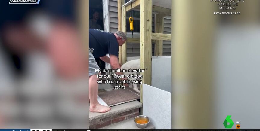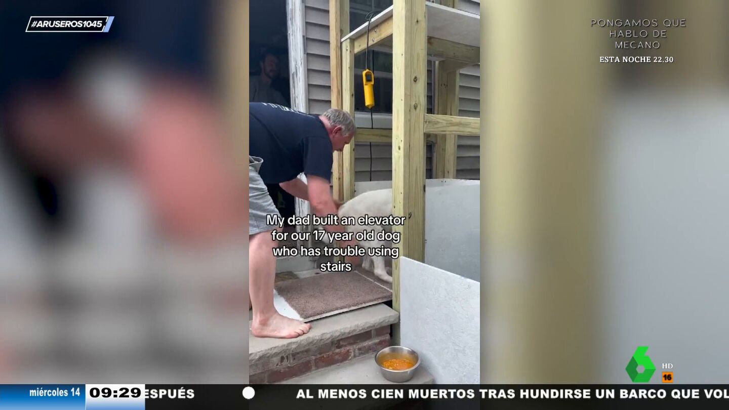 El dueño de este anciano perro ha ideado un ingenioso sistema para que el animal, que tiene problemas para caminar, no tenga que usar las escaleras. Así ha construido un ascensor casero en su casa.