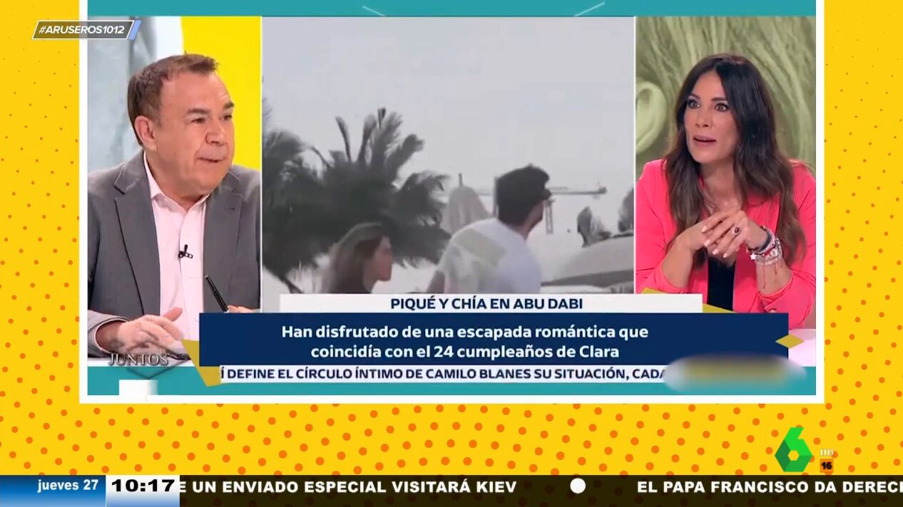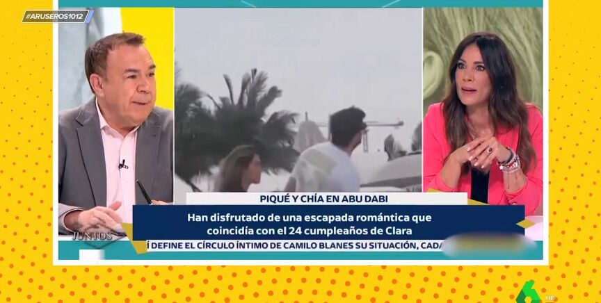 "Su opinión es que ha ido a cerrar contratos y de paso a celebrar le cumpleaños de Clara Chía para quedar bien", explica Alfonso Arús en el plató de Aruseros, donde los colaboradores abren debate. Además, Angie Cárdenas destaca que "ha hecho un dos por uno", pero "no la ha llevado" ya que ambos trabajan en la empresa: "Se han llevado mutuamente".