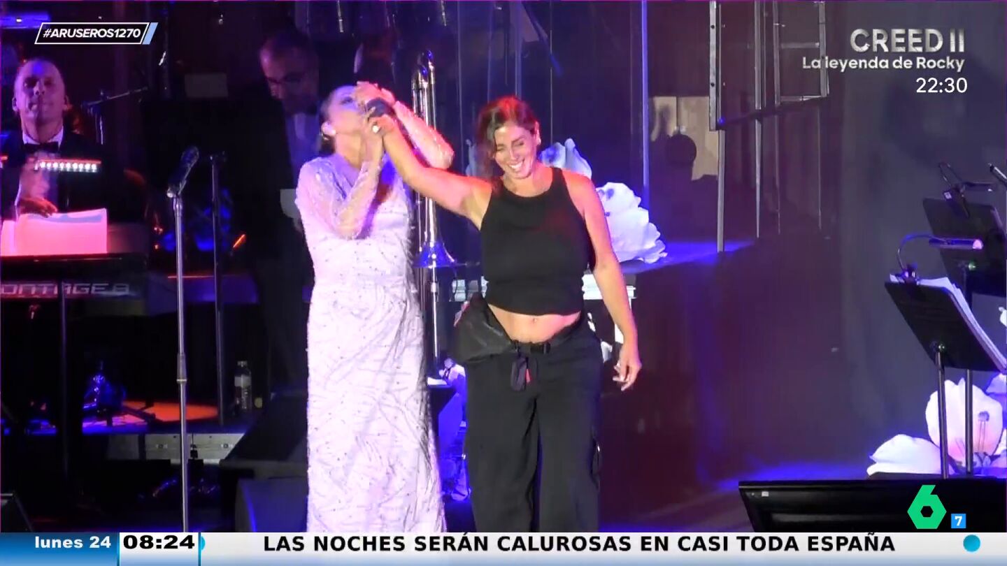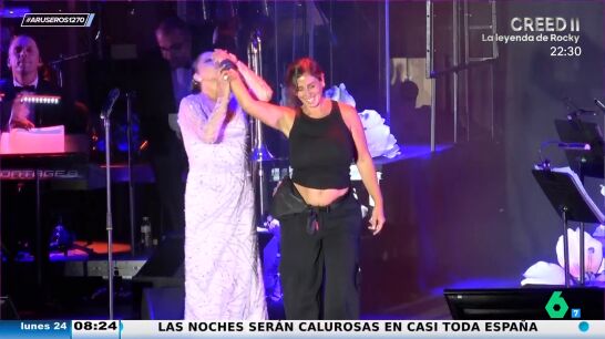Isabel Pantoja la lía en su concierto en Toledo y anuncia el sexo del hijo que espera su sobrina Anabel Pantoja. El momento tiene lugar durante la canción 'Garlochi', en la que la tonadillera pide a su sobrina que suba.
