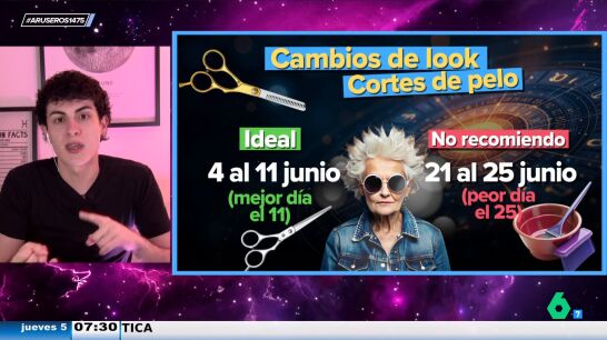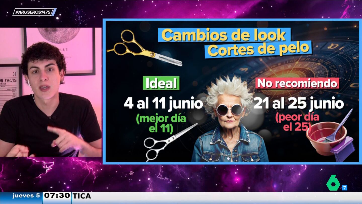 Junio llega transformador en muchos aspectos de la vida para algunos de nuestros espectadores. Tras adelantarnos qué colores tenemos que vestir para atraer vibras positivas y armonía de cara a comenzar el verano con equilibrio, Jabifus, astrólogo de Aruser@s, nos muestra cuáles son los mejores y peores días para realizar un cambio de imagen, teniendo en cuenta el calendario lunar.