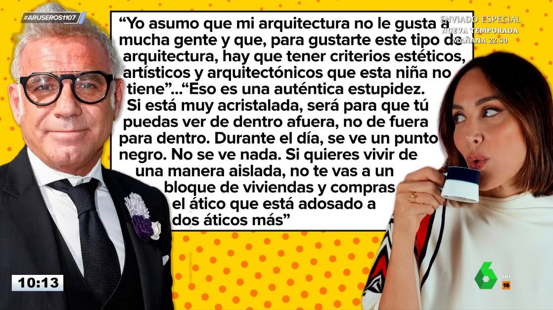 Alfonso Arús enseña en el plató de Aruser@s las declaraciones del arquitecto Joaquín Torres en las que ha lanzado un zasca a Tamara Falcó. "Asumo que mi arquitectura no le gusta a mucha gente y que, para gustar este tipo de arquitectura, hay que tener criterios estéticos, artísticos y arquitectónicos que esta niña no tiene", ha afirmado el arquitecto después de que la marquesa de Griñón haya criticado la lujosa casa que le diseñó para vivir junto a Íñigo Onieva.