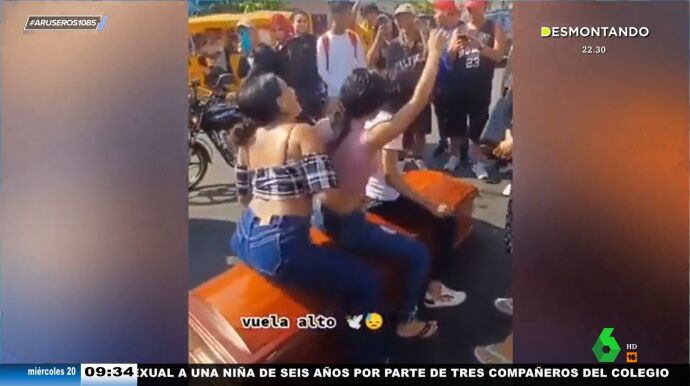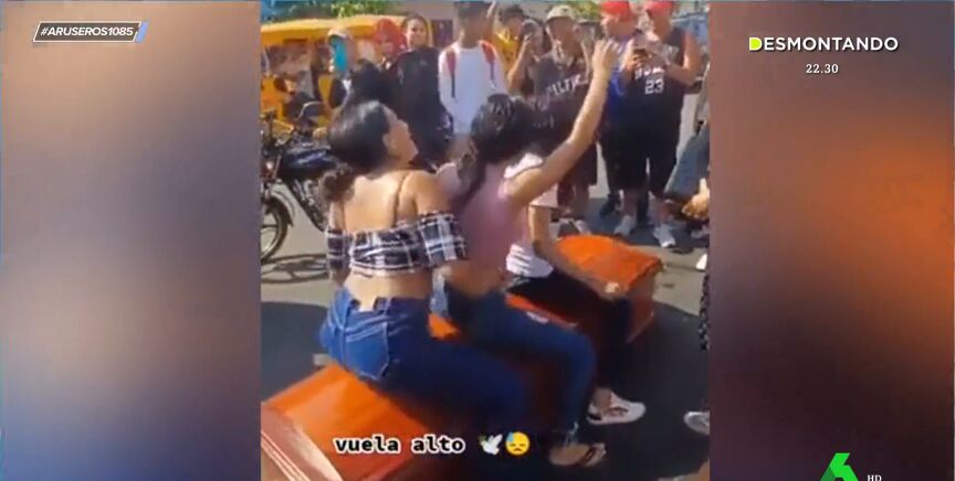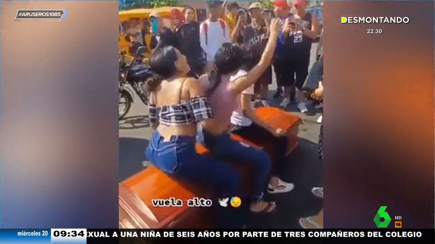 No hay nada mejor para despedirse de una buena amiga que cumpliendo su última voluntad. Así lo han hecho las chicas que vemos en este vídeo, emitido en Aruser@s, que perrean sobre el ataúd de la joven que acaba de morir. "Como la fallecida era muy alegre, bailaron un reggaetón a forma de homenaje", cuenta Alfonso Arús.
