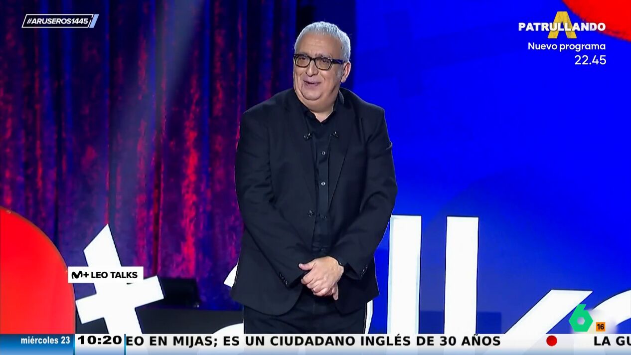 Alfonso Arús muestra en el plató de Aruser@s el nuevo 'zasca' del monologuista Leo Harlem, en su show 'Leo Talks', al desvelar la nueva programación teatral de Madrid.