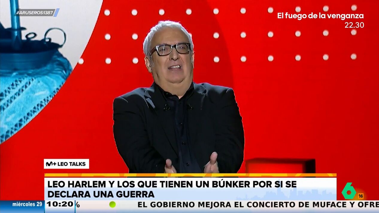 Alfonso Arús enseña el monólogo viral de Leo Harlem sobre los "preparacionistas", las personas que dedican su tiempo y energía a prepararse para el fin del mundo. "Resumiendo, son esas personas que cuando empieza una guerra están deseando que alguien tire la bomba para que no les caduquen las latas del búnker", destaca Leo Harlem.