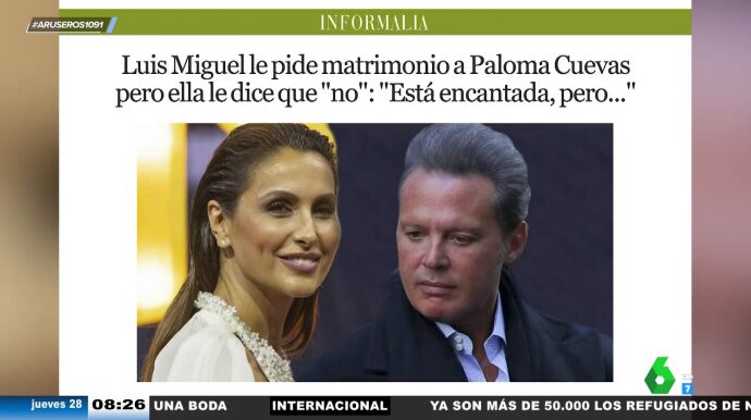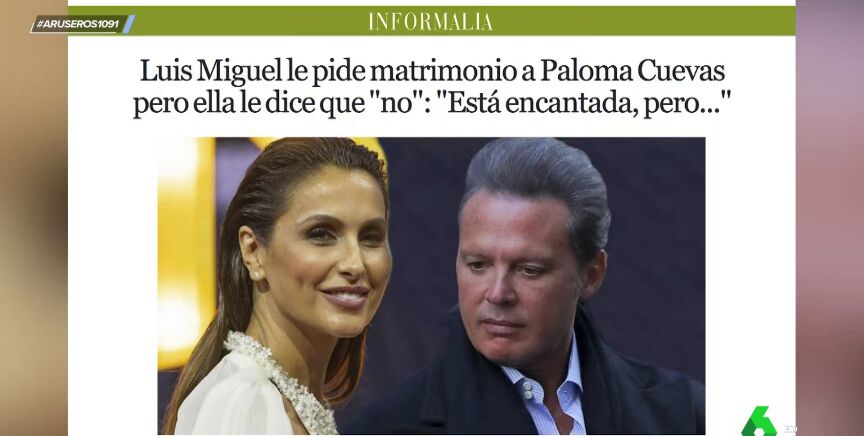 Alfonso Arús destaca en el plató de Aruser@s las últimas novedades sobre la relación entre Luis Miguel y Paloma Cuevas: "Por lo visto, Luismi le habría pedido matrimonio a Paloma y ella lo habría declinado". Tatiana Arús da más detalles en el vídeo principal de esta noticia: "Ella habría dicho que está encantada, pero, de momento, no quiere pasar por el altar". "Parece que quiere esperar un tiempo y acabar de consolidar las cosas", explica la colaboradora, que afirma que esta información ha llegado del entorno de Paloma Cuevas.