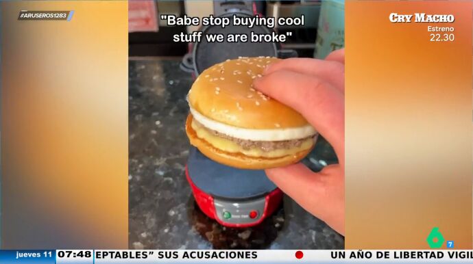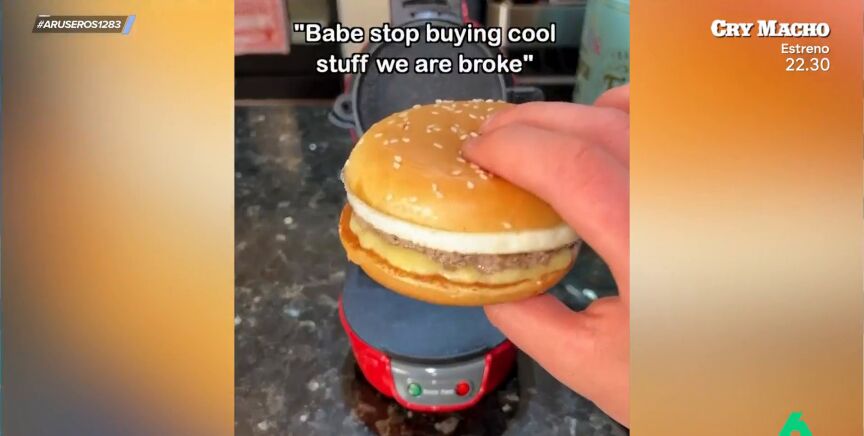 Alfonso Arús trae un vídeo que muestra un invento para ver si gusta a los tertulianos de Aruser@s. El conductor del programa presenta la máquina para crear hamburguesas. El presentador explica que es una máquina que funciona por pisos y permite cocinar por pasos la hamburguesa.