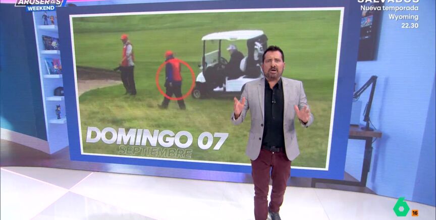 Para empezar, el periodista nos muestra a Donald Trump pillado haciendo trampas jugando al golf. El presidente de los EEUU también ha atacado por las redes a los operarios que han reformado su jardín, quienes le han dejado una grieta de más de 20 metros y los ha despedido... ¿Y es Melania quien está tirando una bolsa por una ventana de la Casa Blanca?