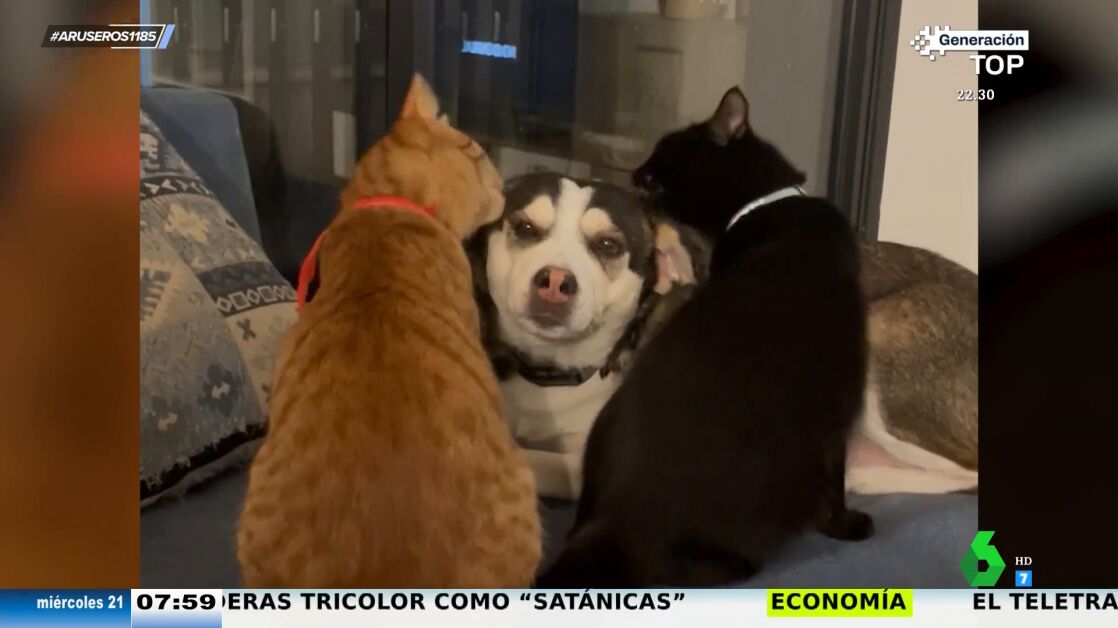 "Es un buen ejemplo multiplicado por dos", comenta Alfonso Arús mientras de paso a estas tiernas imágenes. "¡Está estirado en el sofá con un gato a cada lado!", se sorprende el presentador.